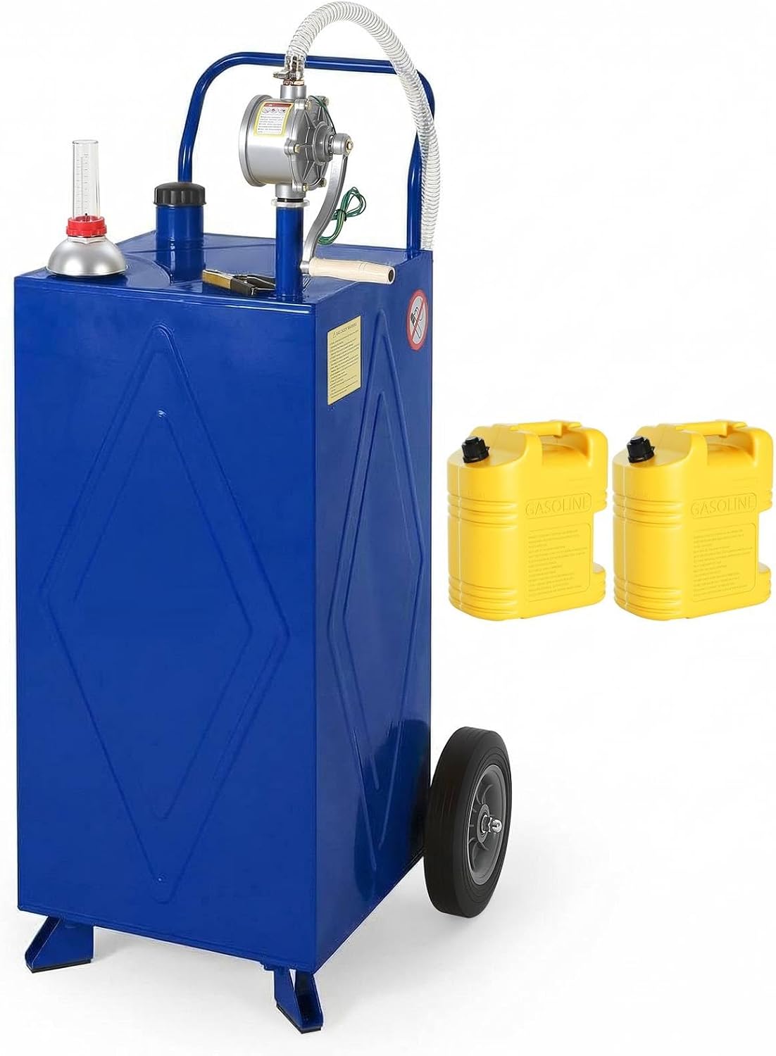 40 Gallon (30+10) Fuel Gas Caddy Storage Tank on Wheels, Portable Gas Caddy with Manual Transfer Pump, Hose, Wide Opening, Fuel Level Gauge and Grounding Clamp, Gasoline Diesel Fuel Tank for Lawn Mower, ATV, Tractor, Car, BoatThis Portable Gas Caddy is a practical fuel transfer solution for users who need a mobile tank for gasoline or diesel. The 30 + 10-gallon Fuel Gas Caddy Storage Tank is designed for transport, controlled pouring, and easier equipment refueling around the home, farm, garage, or jobsite.40 Gallon (30+10) portable fuel transfer capacityManual pump for controlled dispensingWide opening for easier tank fillingFuel level gauge for quick monitoringWheels for smooth transportFits mower, ATV, tractor, boat, and car fueling
