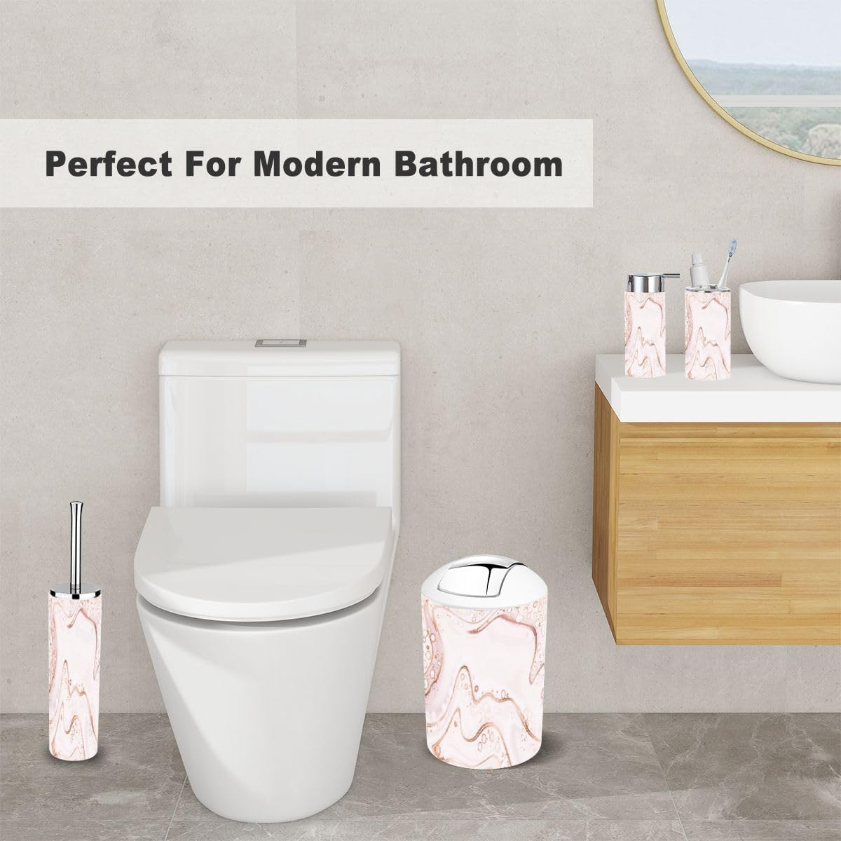 - Lotion DispenserIt can be pressed by one hand and rebound automatically. Use our soap dispenser for liquid hand soap, dish soap, lotion, shampoo, body wash, massage oils, etc.- Toothbrush Cup- Toothbrush HolderFits most sizes of toothbrushes, toothpaste, etc.- Trash CanWith swing lid, it's convenient for using.- Toilet Brush HolderHide the brush head inside the base- Soap DishIt can leak and keep dry.Please Note:1. Please allow tiny size difference for manual measurement.2. Please confirm the size before purchase.