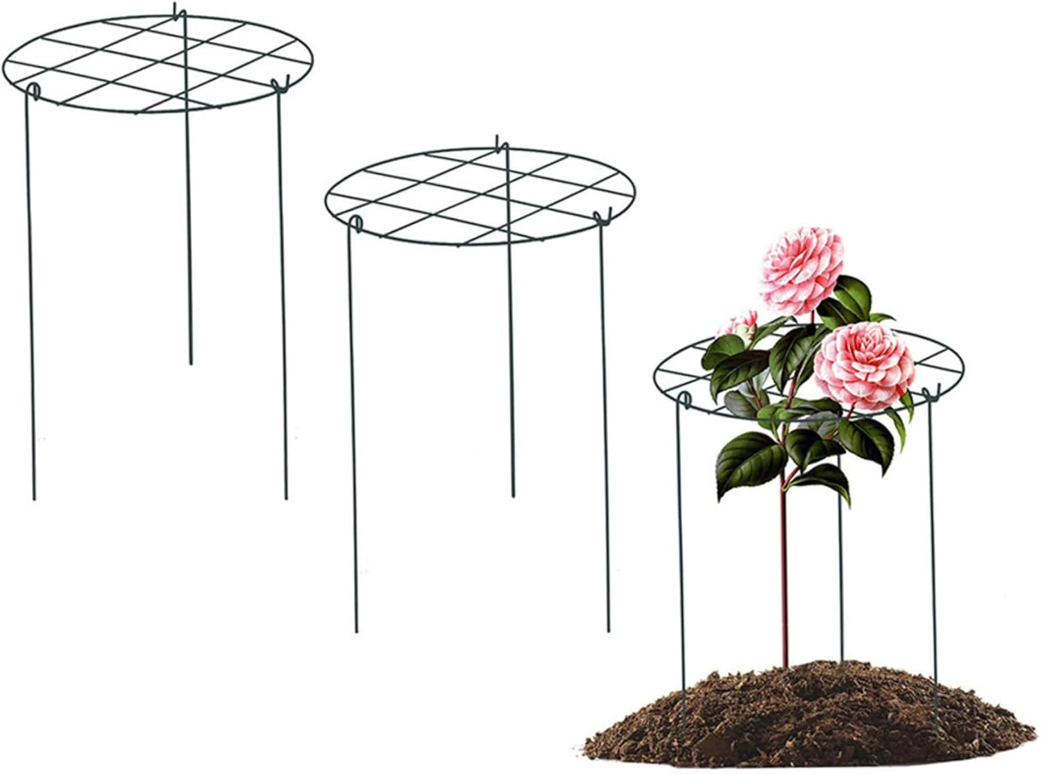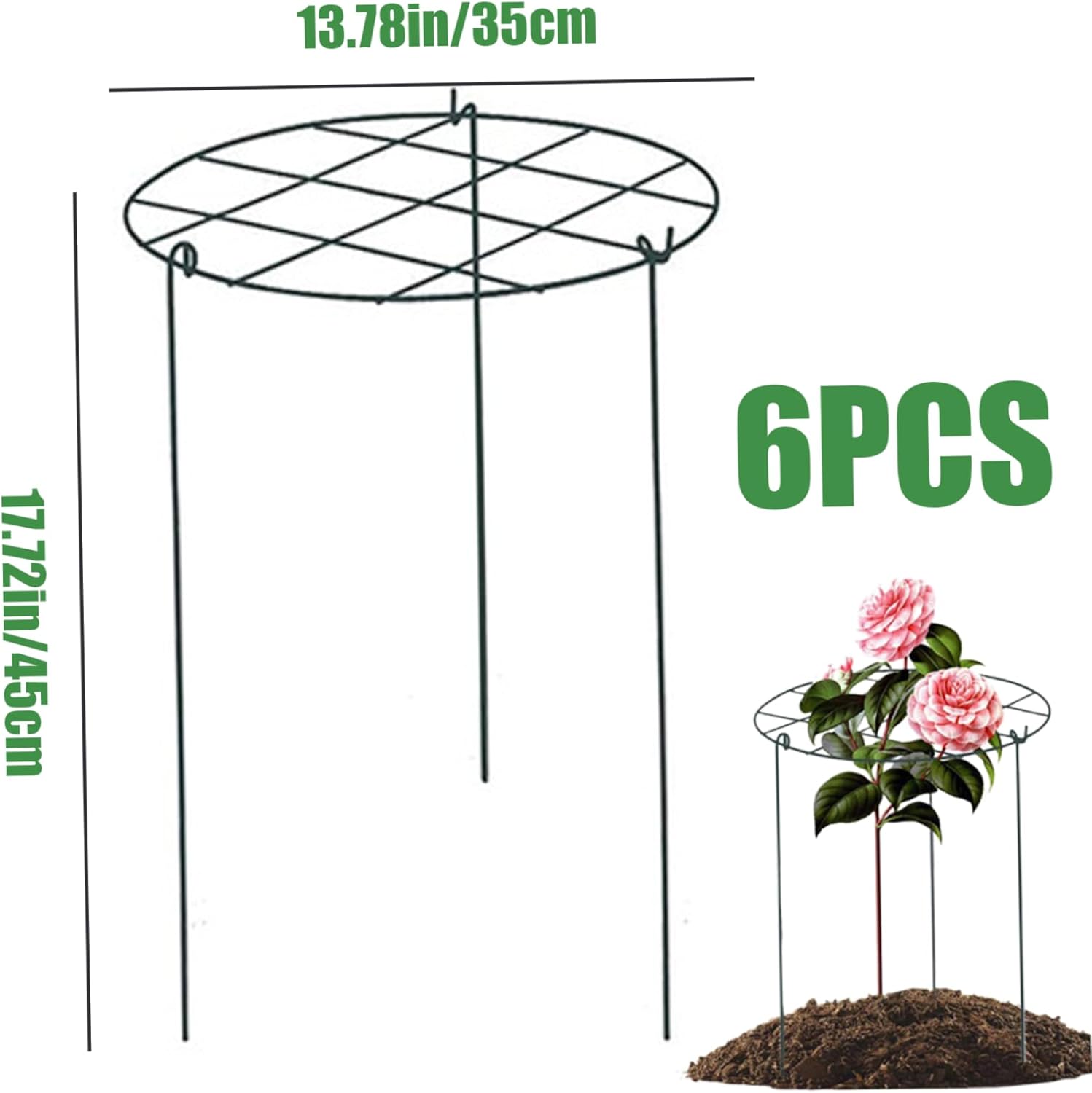 Description: Our plant supports are constructed from iron and feature a green weather-resistant coating. These Peony Cages and Supports are reusable, long-lasting, and outperform traditional wood stakes. The natural green finish seamlessly blends with the foliage, enhancing the overall look of your garden. Perfect for a variety of plants, these Peony Cages and Supports are essential for maintaining the health and appearance of your garden, ensuring your plants look their best throughout the growing season. How To Use:. 1. Install three poles on the hoop. 2. A stable grow-through plant support is available. 3. Position hoop over the young plants. 4. Plants will naturally will grow up and through. Features:. Peony Cages and Supports. -Color: Green. -Material: Iron. -Size: about 35x45 cm/13.78x17.72 inch. Note: Manual measurement, please allow slight errors on size. The colors may exist slight difference due to different screens. Package Including 6 * Peony Cages and Supports