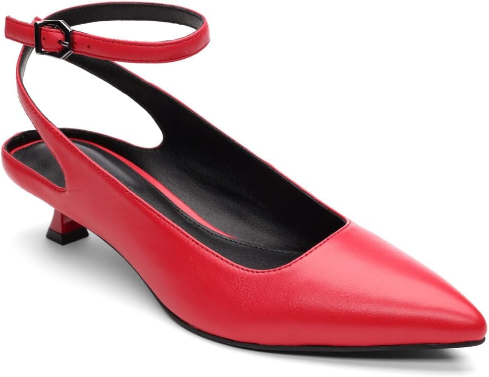 These pumps are MAGIC! The perfect minikitten heel height for comfort and pointy toe and ankle strap for a super chic look. Soft nappa leather upper and bio oil memory foam cushioning make this pump must for all your fall looks.